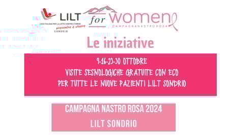 Tutti i mercoledì del mese di ottobre riserviamo un accesso gratuito per visita senologica con ecografia ai nuovi accessi LILT Sondrio.