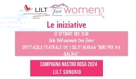 Uno spettacolo teatrale ad offerta libera e consapevole: sabato 12 ottobre presso la sala polifunzionale Don Chiari ( Oratorio San Rocco), Tutti i fondi verranno devoluti a LILT Sondrio per sostenere le attività associative.